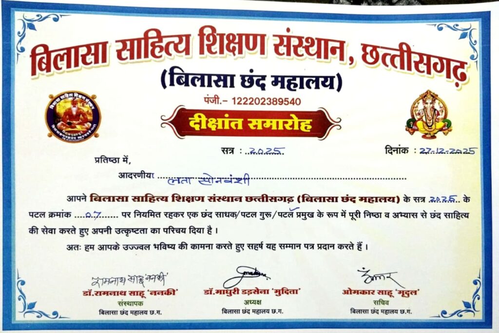 छिंदवाड़ा – शासकीय उच्चतर माध्यमिक विद्यालय पगारा जिला छिंदवाड़ा में पदस्थ लता सोनवंशी को रायपुर के तुलसी मंगलम भवन में बिलासा साहित्य शिक्षण संस्थान छत्तीसगढ़ द्वारा आयोजित तृतीय दीक्षांत समारोह में देश भर से आए साधकों की गरिमामयी उपस्थिति में बिलासा छंद महालय के संस्थापक छन्दाचार्य डॉ. रामनाथ साहू ‘ननकी’ के द्वारा नव प्रस्तारित छंद विधान पर सृजित प्रणत छंद ग्रंथ में अर्ध समवृत छंद लेखन हेतु 129 अन्य सृजनकारों के साथ दी मैजिक बुक ऑफ वर्ल्ड रिकॉर्ड -2025 एवं बिलासा छंद महालय के पटल क्रमांक 07 के पटल प्रमुख के उत्कृष्ट कार्य हेतु सम्मानित किया गया। ज्ञात हो कि लता सोनवंशी को दूसरी बार दी मैजिक बुक ऑफ वर्ल्ड रिकॉर्ड का सम्मान प्राप्त हुआ है। उनको यह सम्मान मिलने पर साहित्यिक परिवार, परिजनों, मित्रगण व अंचल वासियों ने बधाई दी है।