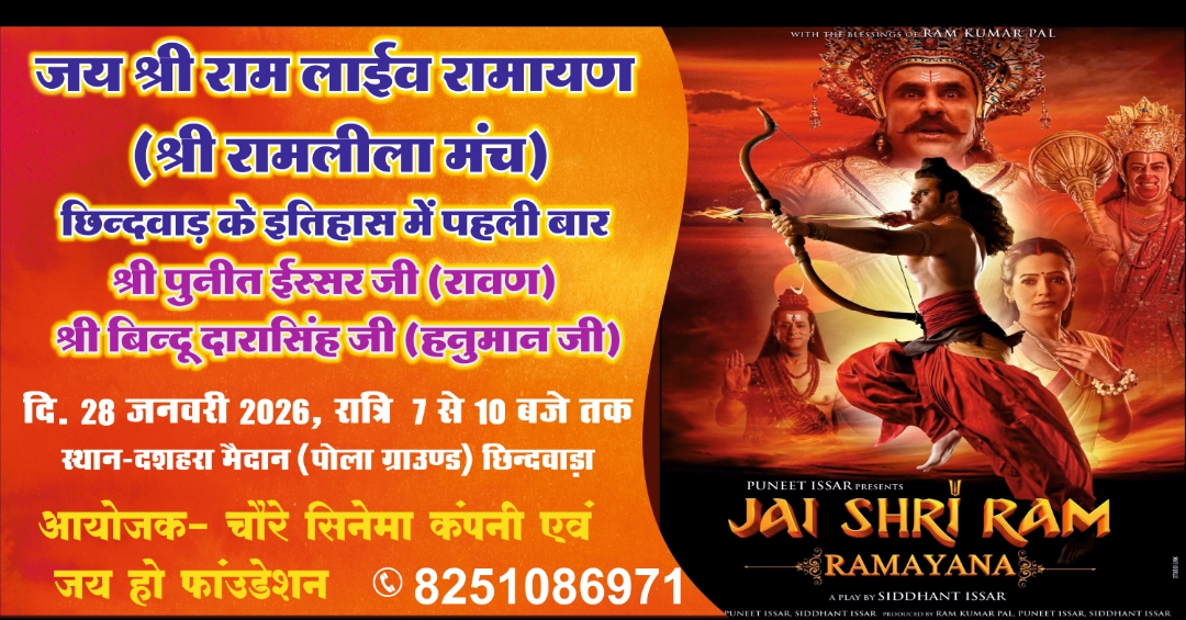 छिंदवाड़ा – छिंदवाड़ा के इतिहास में पहली बार दिग्गज बॉलीवुड अभिनेताओं द्वारा रामायण का लाइव प्रस्तुति हो रहा है। जिसमे बॉलीवुड के दिग्गज कलाकारों द्वारा रामायण के किरदार निभाया जाएगा। इसमे बॉलीवुड अभिनेता औए डायरेक्टर पुनीत इस्सर , बिंदू दारा सिंह और उनकी पूरी टीम द्वारा मुख्य किरदारों को निभाया जाएगा। यह जय श्रीराम रामायण का बहुत ही अनोखा और भव्य शो होने वाला है। इस शो में दिग्गजों के अभिनय और संगीत का संगम के साथ प्रस्तुति होगी ।