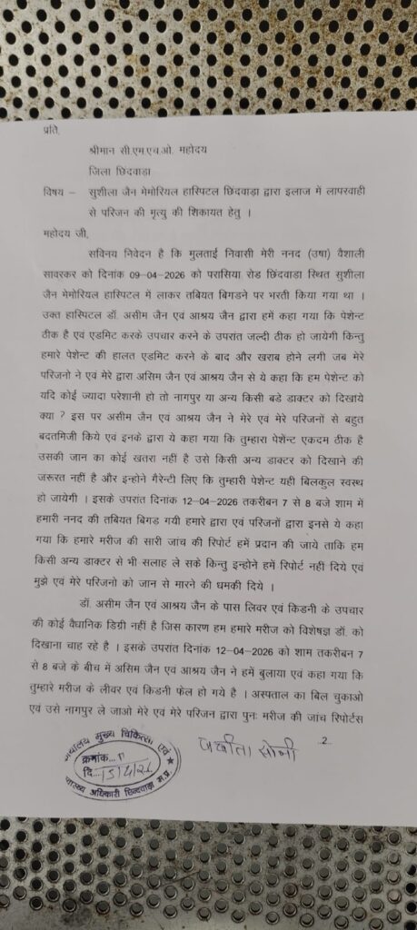 छिंदवाड़ा- छिंदवाड़ा के सुशीला जैन मेमोरियल अस्पताल को मुकेश सोनी ने अपनी बहन की मौत का जिम्मेदार बताया है। मुकेश सोनी ने आरोप लगाया है कि उसकी बहन उषा सावरकर को पेट की बीमारी के इलाज के लिए इस अस्पताल में भर्ती कराया गया था । उनका कहना है कि अस्पताल में अच्छे डॉक्टर के अभाव में उनकी बहन की मौत हो गई । मामला छिंदवाड़ा के मुल्तानी निवासी उषा सावरकर का है जिसमें उनके भाई ने बताया कि उनकी बहन को पेट की बीमारी के इलाज के लिए छिंदवाड़ा के सुशीला जैन मेमोरियल अस्पताल में भर्ती करवाया गया था , लेकिन चार दिन तक इस उचित इलाज नहीं मिलने के कारण उनकी बहन की नागपुर ले जाते समय मौत हो गई।